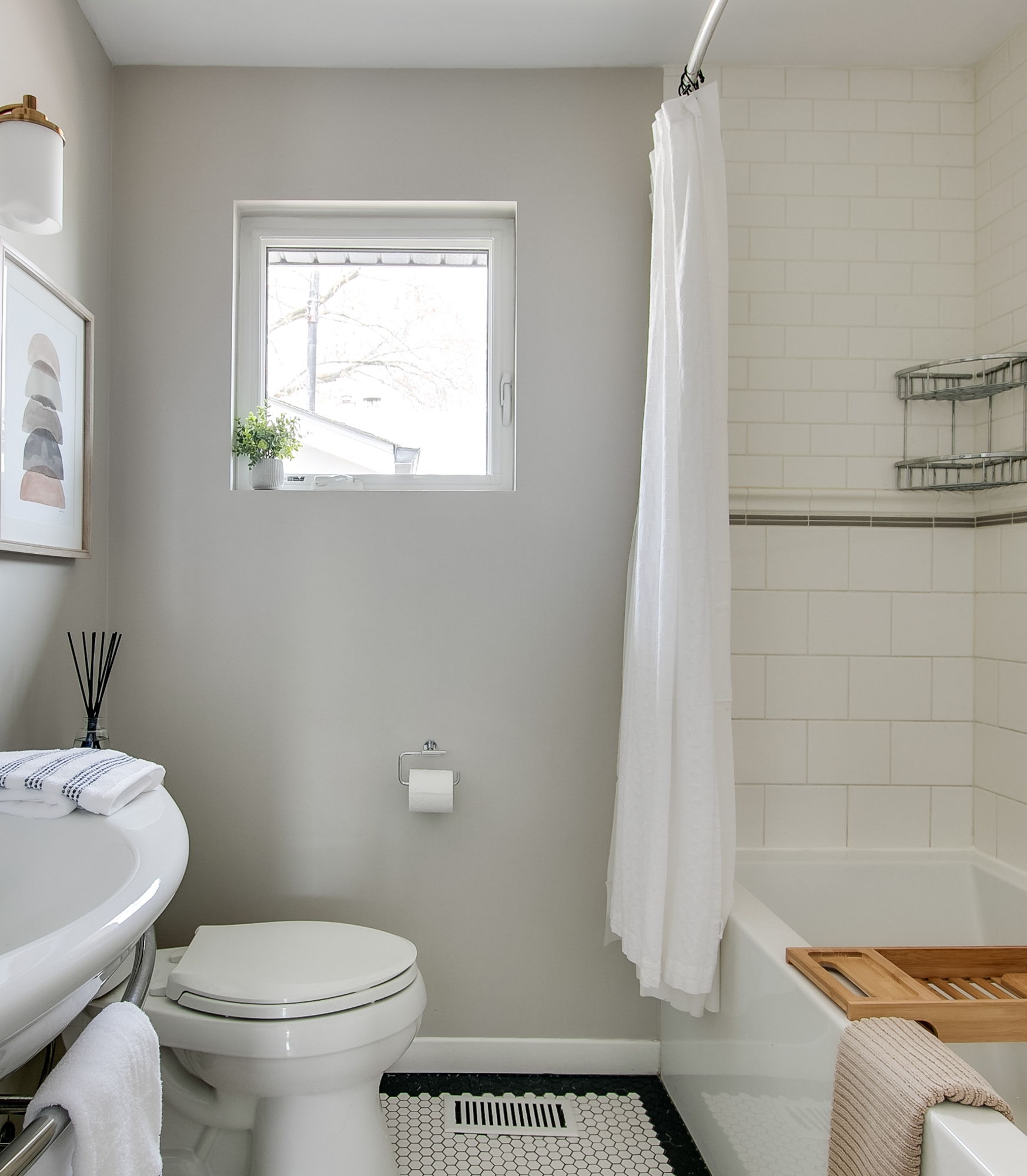 The transitional bathroom fixtures blend seamlessly with the classic Edwardian tiles, creating a refined and relaxing space. The square window is a perfect choice which brings in light without sacrificing privacy.